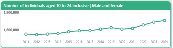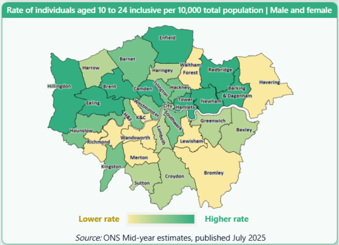 The 10-24 year old population of London has been rising steadily since 2021 according to ONS statistics but it’s distribution across London is quite varied.