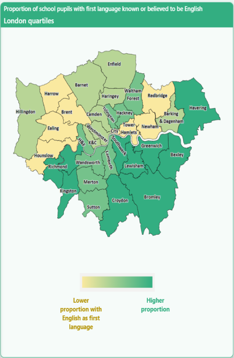 It’s noticeable that the West of London also has lower proportions of school children with English as a first language.