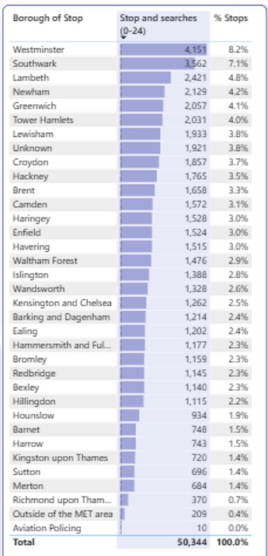 Westminster was the Borough where the largest number of stops took place in 2024 for this age group. What this doesn’t show us is the home Borough of the young people. Greenwich is the only outer London Borough that features in the top seven stop areas, although it could be argued it’s as much inner London as Newham.