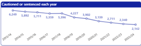 The latest complete year for these statistics is the 2023/2024 financial year. They come from the Youth justice Board. In that year there were 2,142 children aged 10-17 sentenced. A positive thing to note is that this number has been decreasing year on year from 2013/2014.
