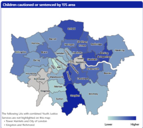 The distribution map of the cautions or sentences across London, does have some similarities with the distribution map of income deprivation across London. However, having said that, the numbers here are far smaller and therefore, statistically, we should treat them with greater caution.
