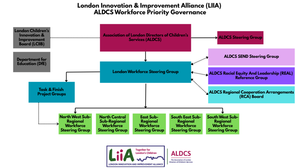 The workforce programme is led by ALDCS Workforce Policy Lead, Julie Kelly (DCS Brent), under the direction of the London Workforce Steering Group. The programme reports directly to ALDCS and the LIIA Board, and there are several Task & Finish Groups and Reference Groups that oversee the delivery of key projects including the ALDCS Racial Equity And Leadership (REAL) programme, the ALDCS SEND Steering Group and the ALDCS Regional Cooperation Arrangements (RCA) Board to ensure join up across all regional activities,